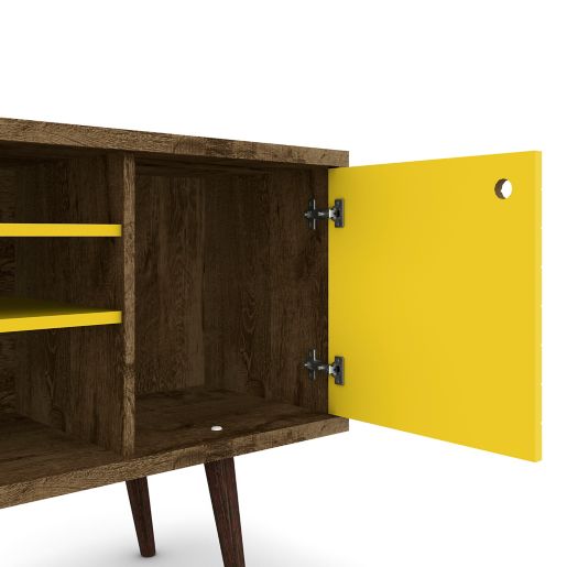 The liberty 5314 mid century modern tv stand is the perfect blend of quality craftsmanship brilliant design and purposeful functionality liberty tv stand. Featuring a large open compartment, one hidden cubby, and three center shelves to create the ultimate entertainment center perfect for stashing dvds, board games.
